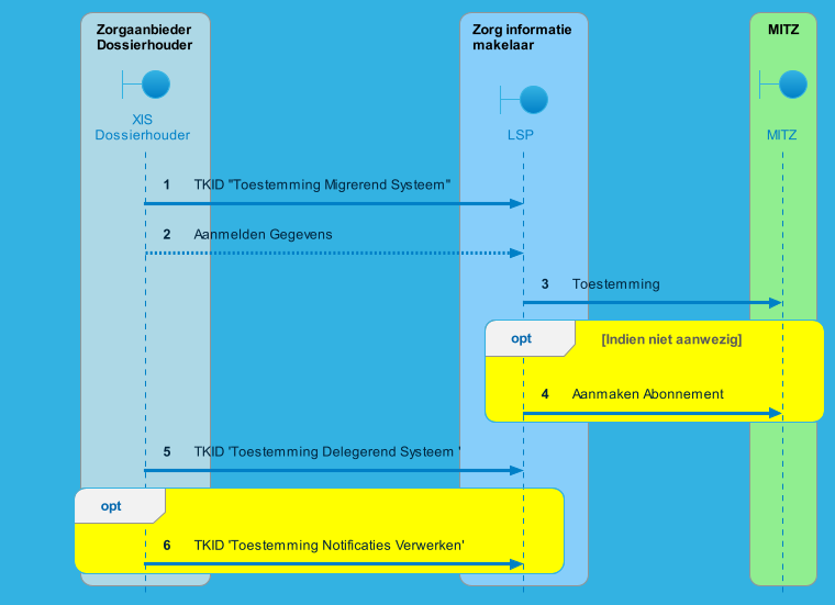 Bij iedere aanmelding wordt er door het LSP gekeken of er al al een ToestemmingsAbonnement is aangemeld voor de combinatie BSN en APP-ID. Is dit niet het geval, dan wordt er een ToestemmingsAbonnement genomen bij Mitz.