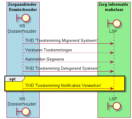 Een systeem zonder active locale toestemmingscontrolle kan pas dossiers gaan aanmelden bij het LSP nadat het systeem heeft via een TKID bericht aangegeven dat het een Toestemming Gedelegeerd Systeem is. Dit om te voorkomen dat er regsitraties worden gedaan die in strijd zijn met de wensen van de patient.